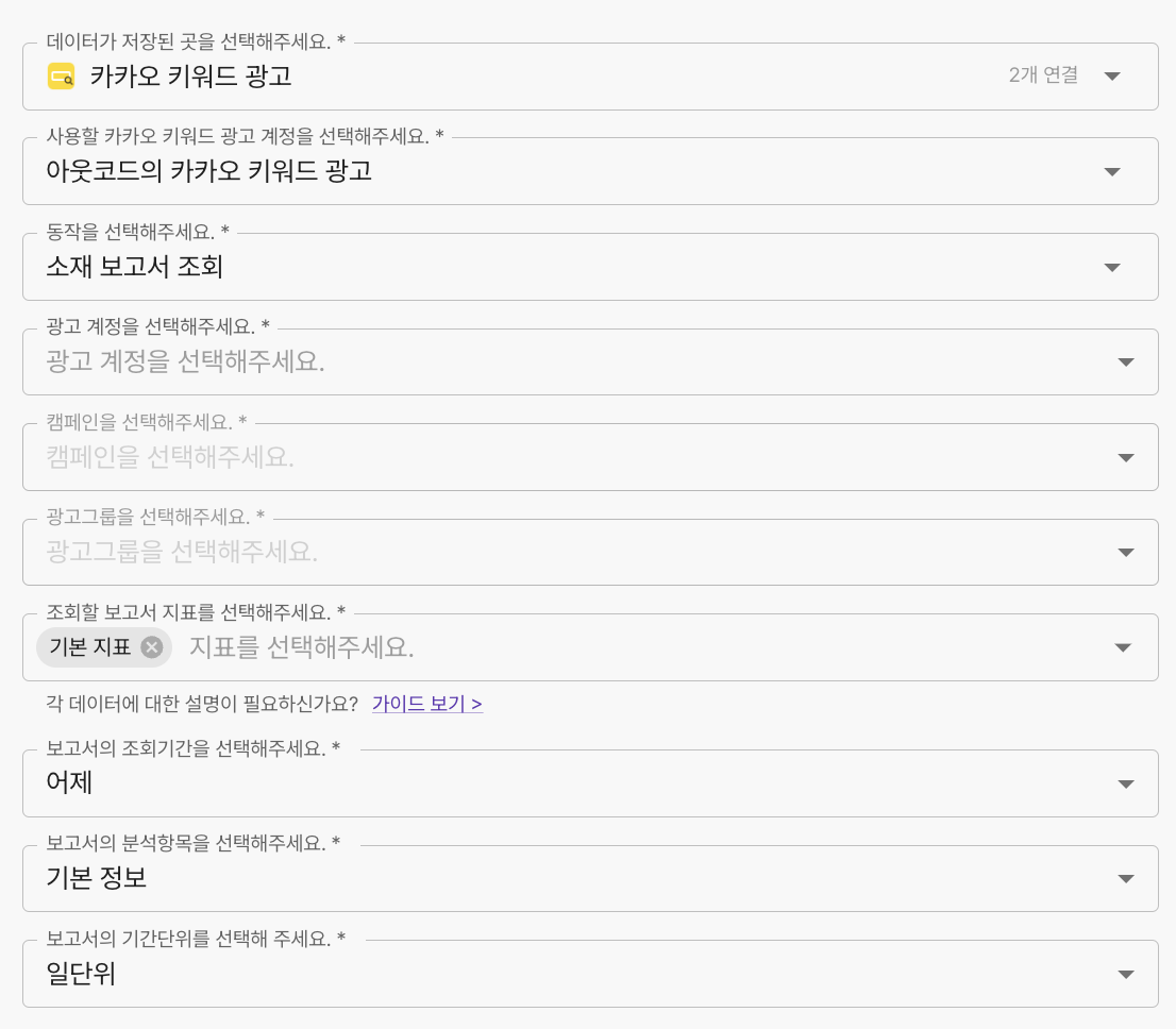 <table><thead><tr><th width="173" align="center">항목명</th><th width="288" align="center">항목소개</th><th align="center">비고</th></tr></thead><tbody><tr><td align="center">광고계정</td><td align="center">광고 계정 선택</td><td align="center"></td></tr><tr><td align="center">캠페인</td><td align="center">광고계정과 관련된 캠페인 선택</td><td align="center"></td></tr><tr><td align="center">광고그룹</td><td align="center">캠페인과 관련된 광고그룹 선택</td><td align="center"></td></tr><tr><td align="center">보고서 지표 선택</td><td align="center">조회할 보고서 지표 선택</td><td align="center"><ul><li>기본 지표 (기본값)</li><li>추가 지표</li><li>픽셀 &#x26; SDK 전환 지표</li><li>카카오친구 지표</li></ul><p>상세내역 하단 실행 결과 내용 참조</p></td></tr><tr><td align="center">조회기간 선택</td><td align="center">보고서 조회기간 선택</td><td align="center"><ul><li>어제(기본값)</li><li>오늘</li><li>최근 7일</li><li>최근 14일</li><li>최근 30일</li><li>이번 달</li><li>지난 달</li></ul></td></tr><tr><td align="center">보고서 분석항목</td><td align="center">보고서 상세 분석 항목 선택</td><td align="center"><ul><li>기본정보 (기본값)</li><li>시간대</li><li>디바이스</li><li>매체유형</li><li>매칭유형</li><li>소재타입</li></ul></td></tr><tr><td align="center">기간 단위 선택</td><td align="center">보고서 조회 기간 단위 선택</td><td align="center"><ul><li>일단위 : 31일 내의 데이터를 조회</li><li>주단위 : 62일 내의 데이터를 조회</li><li>월단위 : 12개월 내의 데이터를 조회</li></ul></td></tr></tbody></table>