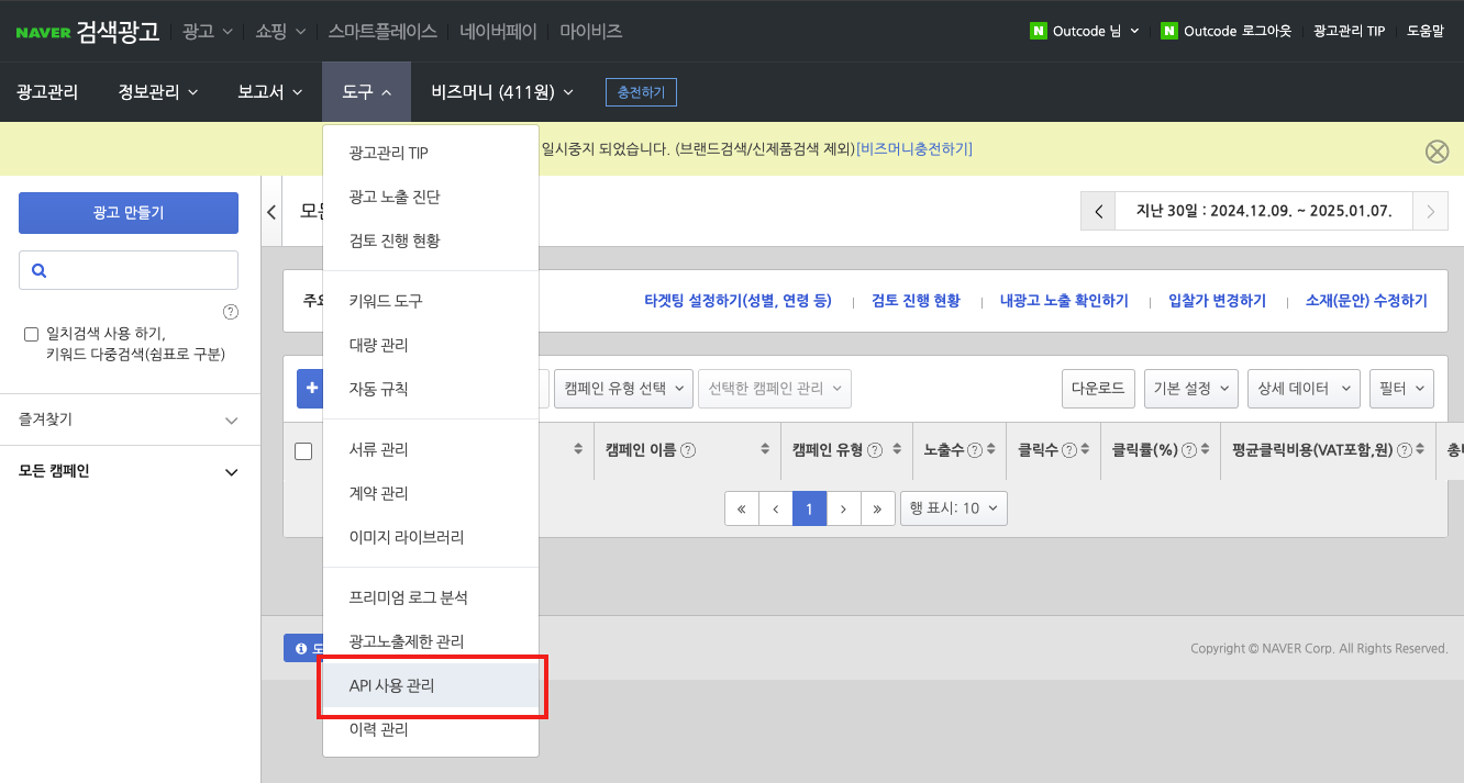 2. 대시보드에서 도구 메뉴 > API 사용 관리 페이지로 이동합니다.