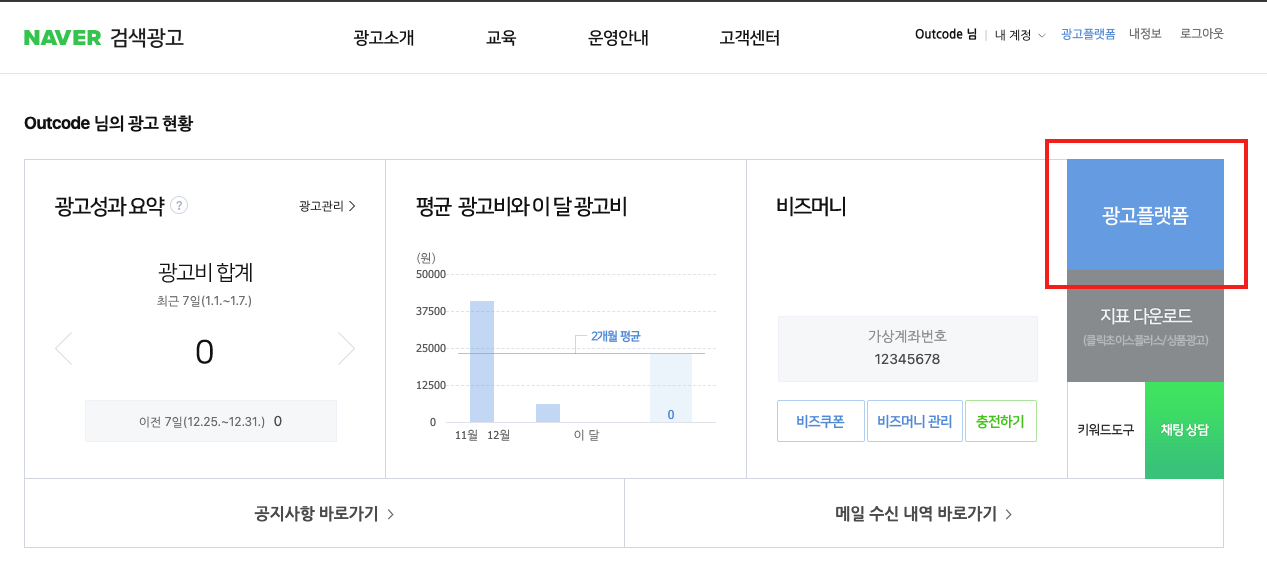 1. 네이버 검색광고 페이지에 로그인 후 우측의 광고플랫폼 버튼을 클릭하여 대시보드로 이동합니다.