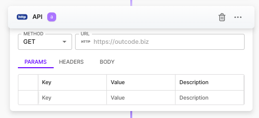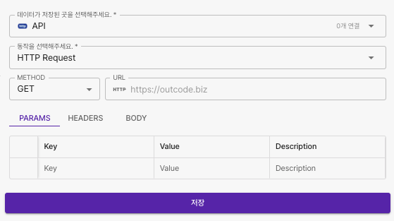 <table><thead><tr><th width="137" align="center">항목명</th><th width="292" align="center">항목소개</th><th align="center">비고</th></tr></thead><tbody><tr><td align="center">METHOD</td><td align="center">API 의 Http Method</td><td align="center">GET, POST, PUT, DELETE, PATCH<br>HEAD, OPTIONS </td></tr><tr><td align="center">URL</td><td align="center">호출하고자 하는 API 주소</td><td align="center">완전한 URL 주소 입력<br>예) https://api.outcode.biz/endpoint</td></tr><tr><td align="center">PARAMS</td><td align="center">URL 끝에 추가되는 키(Key)와 값(Value) 의 조합<br>예) key=value </td><td align="center">파라미터가 포함된 URL 주소를 붙여넣었다면 자동완성됨<br>예) https://api.outcode.biz/endpoint?name=outcode</td></tr><tr><td align="center">HEADERS</td><td align="center">인증, 데이터 요청 방식을 서버에 알리는 역할을 하는 키(Key)와 값(Value)의 쌍인 메타데이터</td><td align="center">API 에서 별도의 요청 헤더 항목이 있다면 필수 입력<br>예) Content-Type (Key) <br>application/json (Value) </td></tr><tr><td align="center">BODY</td><td align="center">서버로 전송되는 실제 데이터로 생성, 수정 목적의 API 호출시 사용</td><td align="center">예) { "name" : "outcode" } </td></tr></tbody></table>