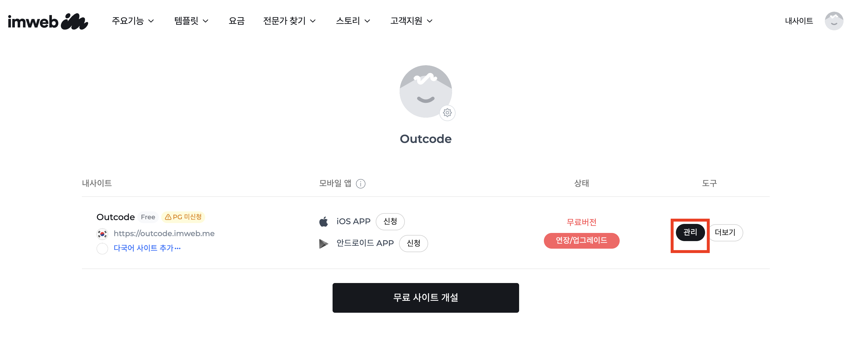 사이트 목록에서 연동을 원하는 사이트 항목의 관리 버튼을 눌러 대시보드로 이동합니다.