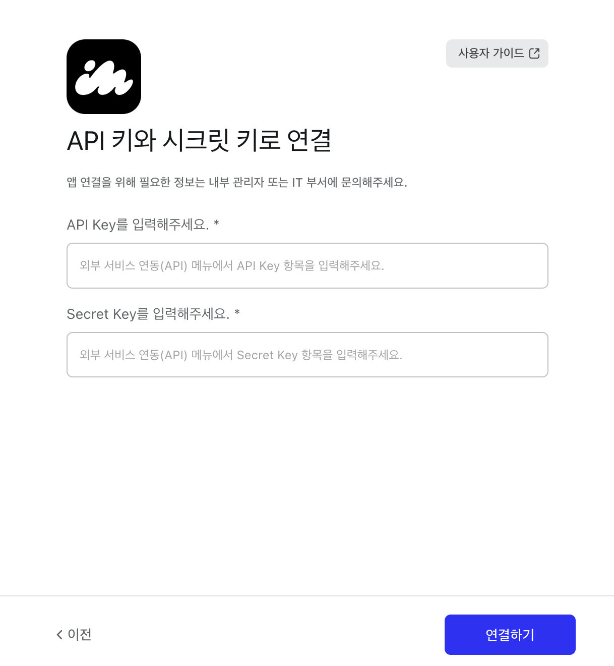연결 페이지에서 각 항목에 알맞는 키를 붙여넣어주시고 연결하기 버튼을 누르면 앱이 생성됩니다.