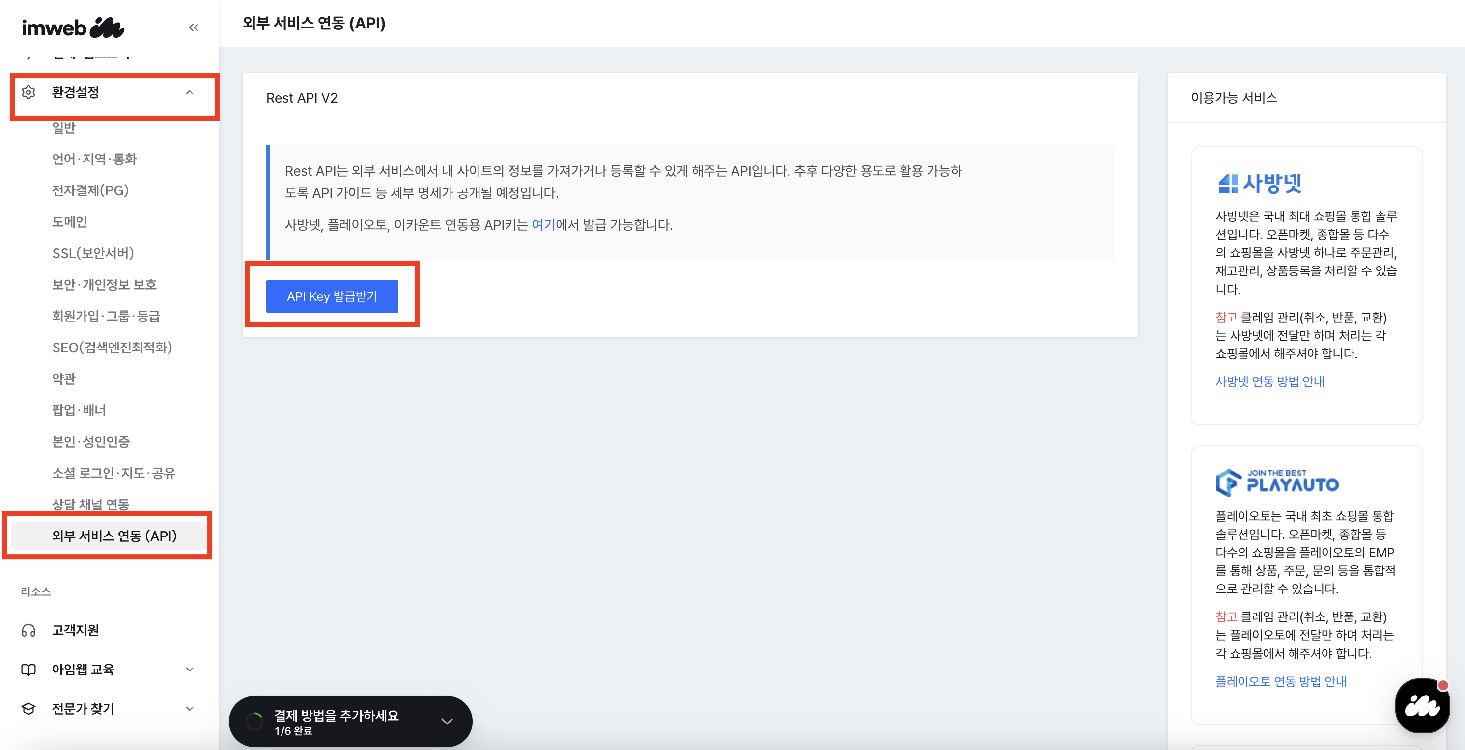 대시보드 페이지에서 환경설정 > 외부 서비스 연동(API) 메뉴로 이동 후 Rest API V2 페이지의 API Key 발급받기 버튼을 눌러 키를 생성합니다.