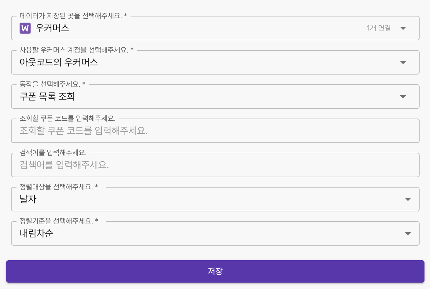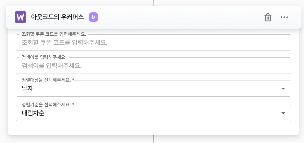 <table><thead><tr><th width="173" align="center">항목명</th><th width="288" align="center">항목소개</th><th align="center">비고</th></tr></thead><tbody><tr><td align="center">쿠폰 코드</td><td align="center">특정 쿠폰 코드를 조회합니다. (선택)</td><td align="center"></td></tr><tr><td align="center">검색어</td><td align="center">검색어와 일치하는 쿠폰을 조회합니다. (선택)</td><td align="center"></td></tr><tr><td align="center">정렬 대상 선택</td><td align="center">쿠폰을 정렬할 대상을 선택합니다.</td><td align="center"><ul><li>날자 : 쿠폰 발행일 기준으로 정렬합니다. (기본값) </li><li>수정일 : 쿠폰정보 수정일 기준으로 정렬합니다. </li><li>쿠폰 ID : 쿠폰 ID를 기준으로 정렬합니다. </li><li>쿠폰코드 : 쿠폰코드를 기준으로 정렬합니다. </li><li>슬러그 : 쿠폰의 슬러그를 기준으로 정렬합니다. </li></ul></td></tr><tr><td align="center">정렬 기준 선택</td><td align="center">정렬 대상의 조회 기준을 선택합니다. </td><td align="center"><ul><li>내림차순(기본값) </li><li>오름차순 </li></ul></td></tr></tbody></table>