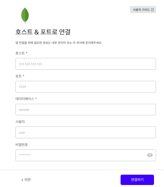 <table><thead><tr><th width="133" align="center">필드명</th><th width="288" align="center">설명</th><th align="center">상세</th></tr></thead><tbody><tr><td align="center">호스트</td><td align="center">MongoDB 서버 주소</td><td align="center">IP 또는 도메인 주소</td></tr><tr><td align="center">포트</td><td align="center">MongoDB 포트번호</td><td align="center">포트번호 (1 ~ 65535)</td></tr><tr><td align="center">데이터베이스</td><td align="center">데이터베이스명</td><td align="center"></td></tr><tr><td align="center">사용자</td><td align="center">사용자명(username)</td><td align="center"></td></tr><tr><td align="center">비밀번호</td><td align="center">사용자 비밀번호</td><td align="center"></td></tr></tbody></table>
