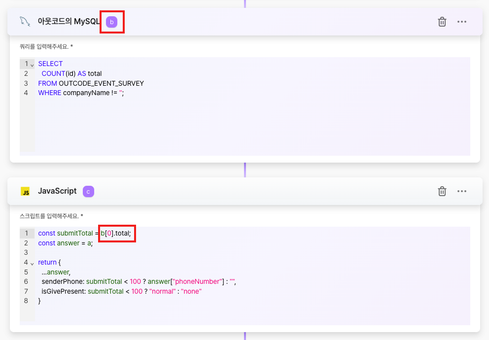 1. 데이터플로우 상에 태스크 제목 옆 알파벳 기호는 데이터 참조 기호입니다. MySQL 에서 조회한 배열의 첫번째 총합(total) 값을 기준으로 데이터를 가공, 전달하려고 합니다.&#x20;