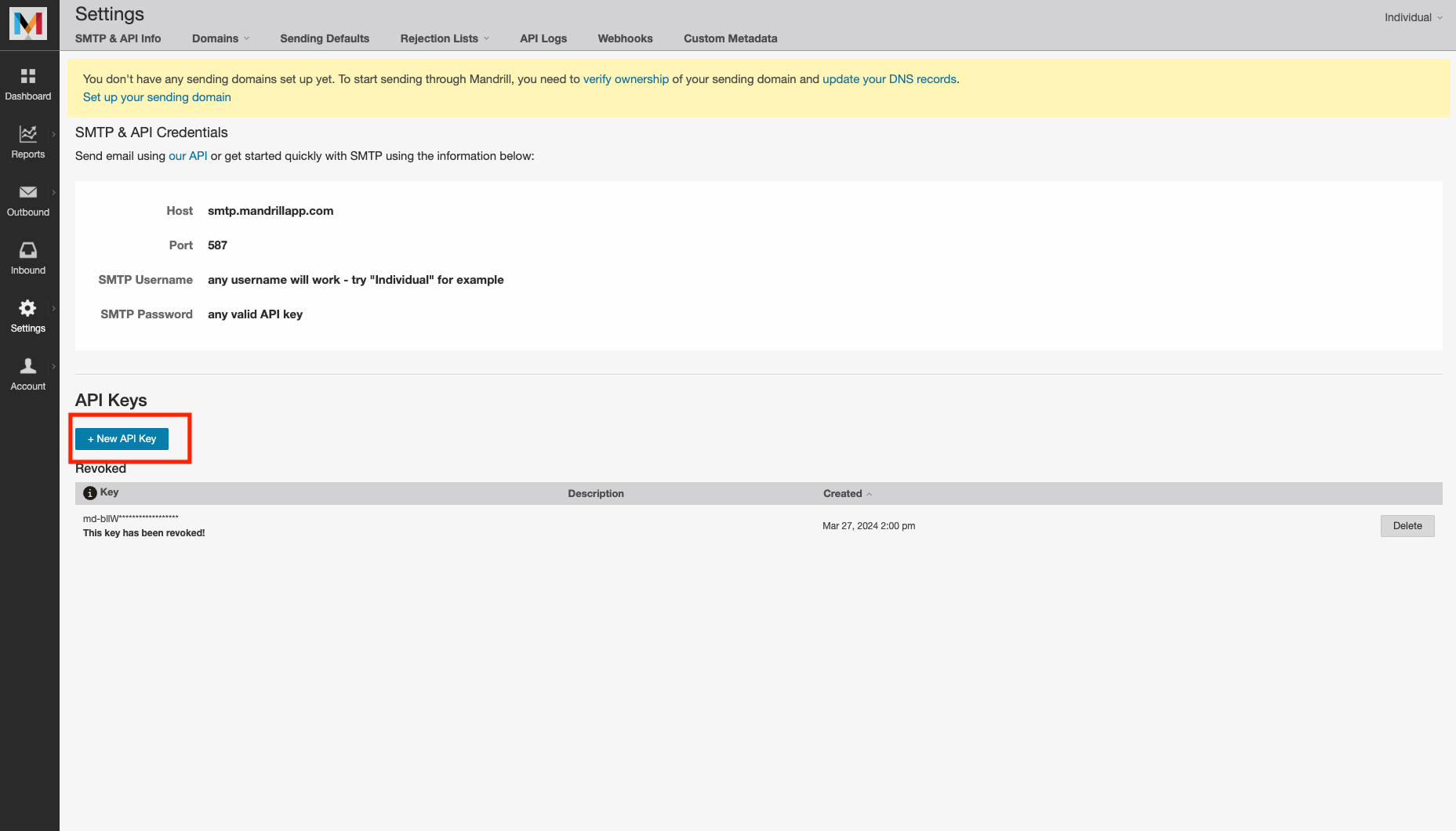 1. Mandrill 대시보드에서 왼쪽 Settings 메뉴를 클릭합니다.&#x20;