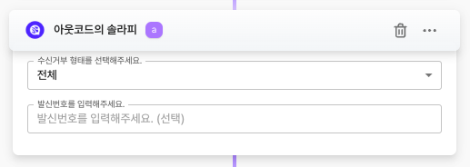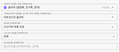 <table><thead><tr><th width="162" align="center">항목명</th><th width="376" align="center">항목소개</th><th align="center">비고</th></tr></thead><tbody><tr><td align="center">수신거부 형태</td><td align="center">수신거부 형태에 따라 조회 가능</td><td align="center">전체(기본값)<br>080수신거부 : 솔라피 수신거부 전화번호를 통한 수신거부<br>스팸신고건 : KISA 차단 번호</td></tr><tr><td align="center">발신번호</td><td align="center">조회할 발신번호 입력(선택)</td><td align="center"></td></tr></tbody></table>