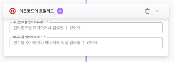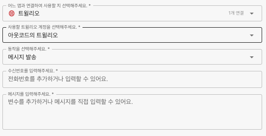 <table><thead><tr><th width="173" align="center">항목명</th><th width="288" align="center">항목소개</th><th align="center">비고</th></tr></thead><tbody><tr><td align="center">수신번호 입력</td><td align="center">메세지를 수신할 전화번호</td><td align="center">국가번호를 포함하여 입력<br>예) +821012345678</td></tr><tr><td align="center">메세지 내용 입력</td><td align="center">메세지 내용 입력</td><td align="center"></td></tr></tbody></table>