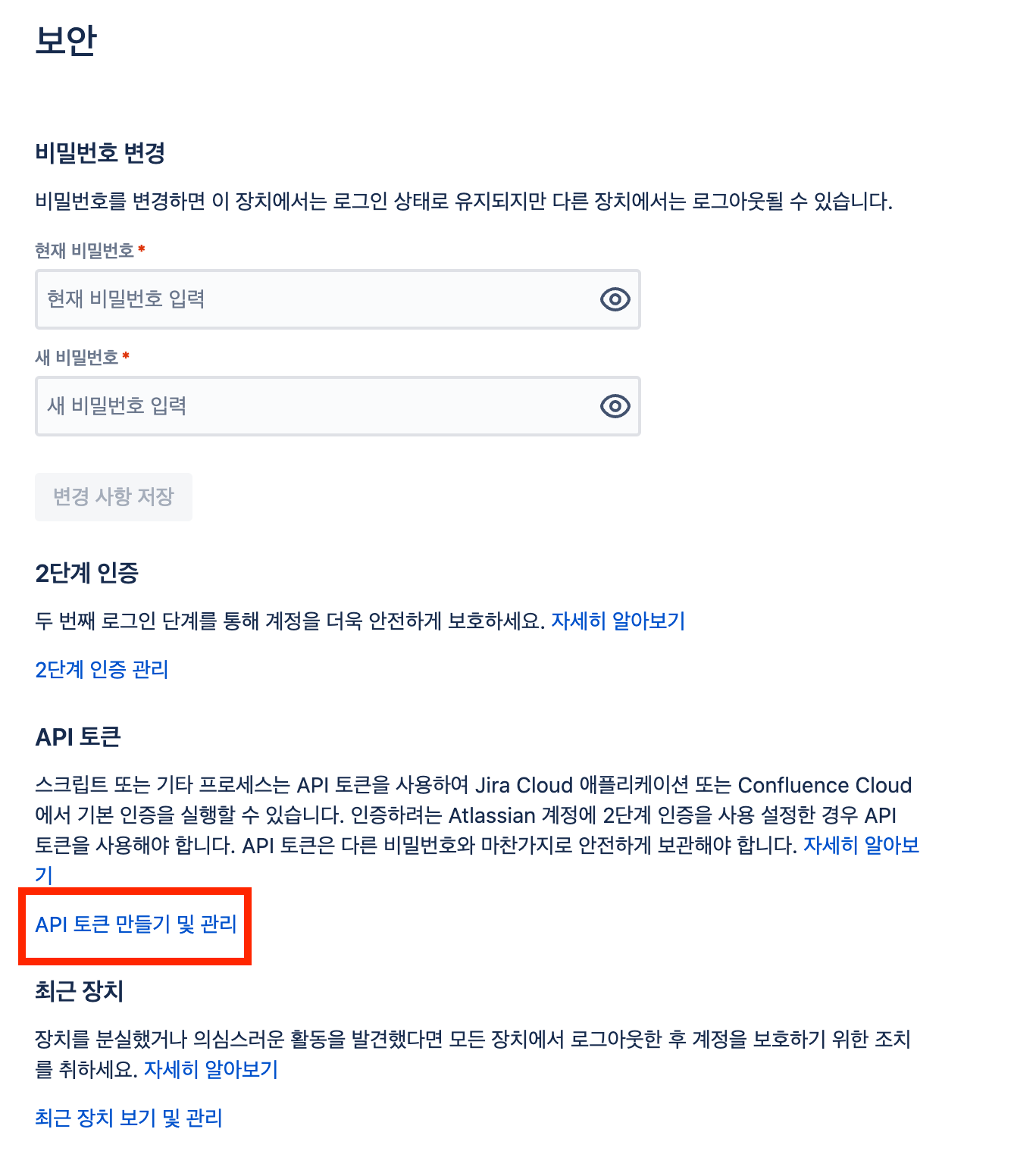 3. 보안 페이지에서 API 토큰 항목의 **API 토큰 만들기 및 관리** 버튼을 클릭합니다.&#x20;