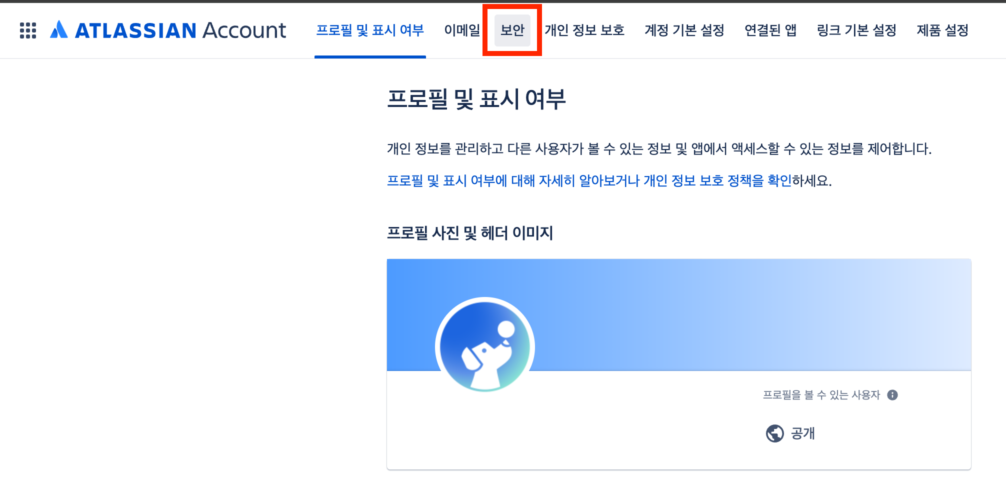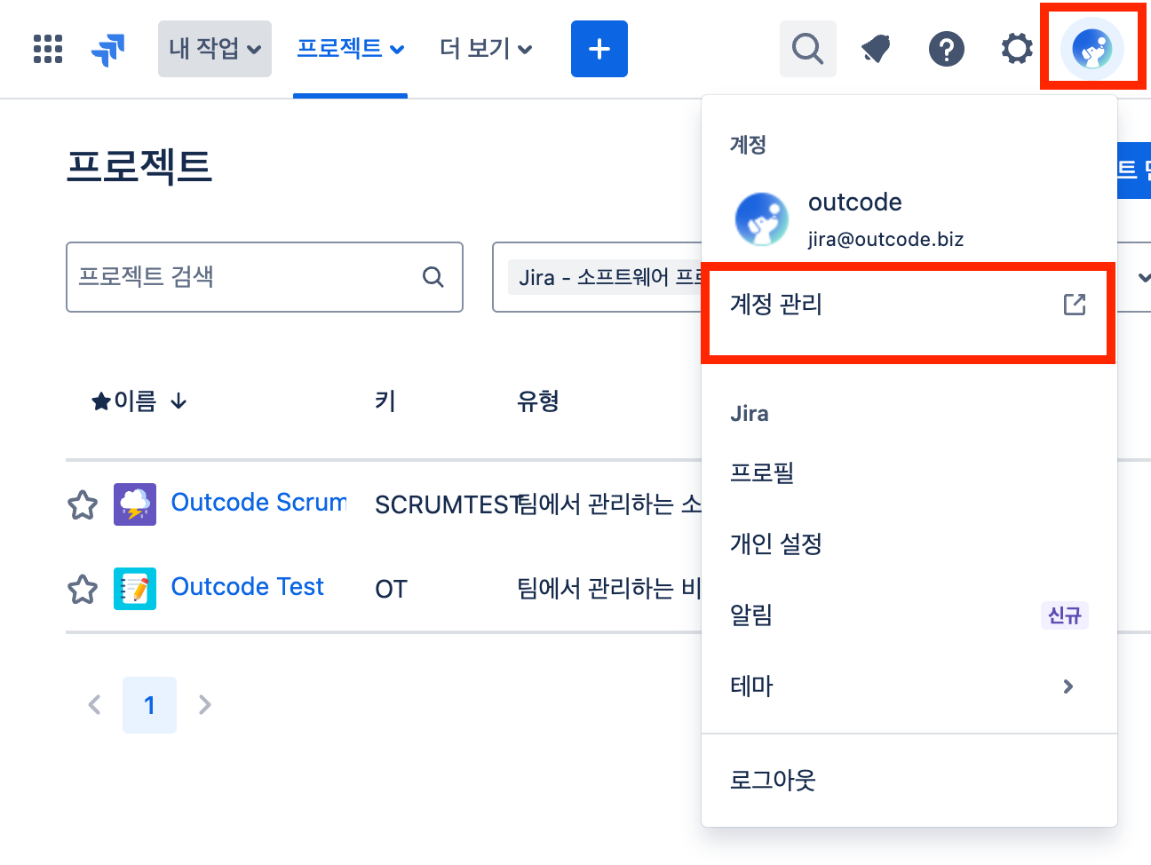 1. Jira 페이지에서 우측 상단의 **프로필 사진을 클릭** 후 **계정 관리** 버튼을 클릭하여 새 탭으로 이동합니다.