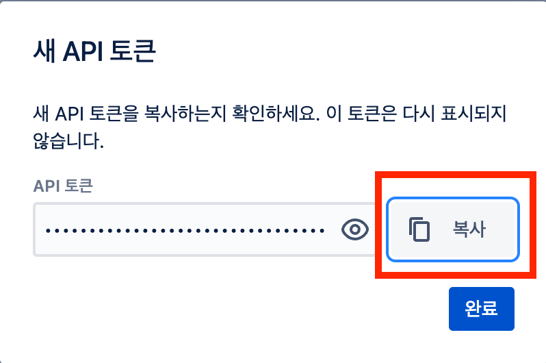 6. 성공적으로 API 토큰을 만들었다면 복사 버튼을 눌러 키를 보관합니다. 창을 닫으면 생성된 API 토큰을 조회할 수 없습니다. 외부에 유출되지 않는 안전한 공간에 토큰을 보관하세요.&#x20;