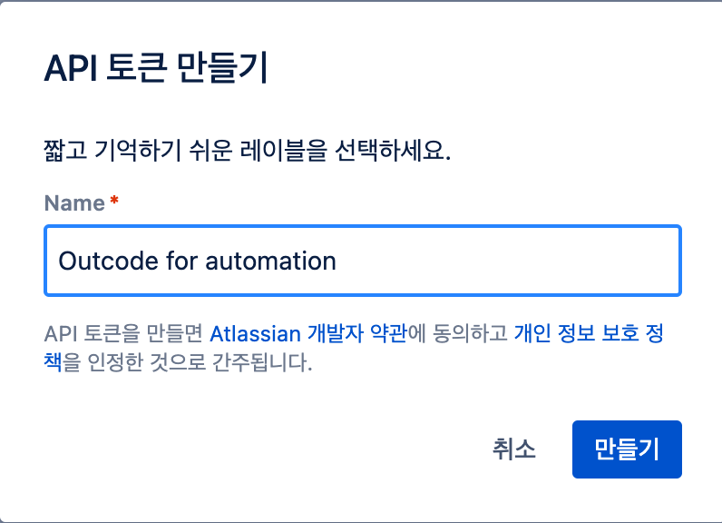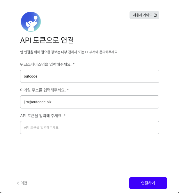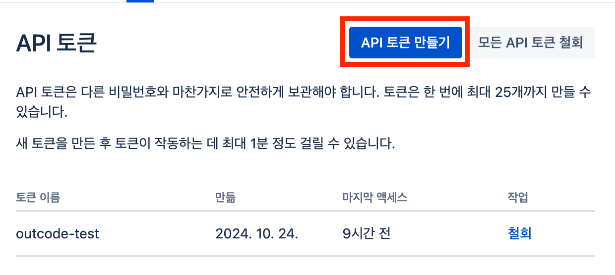 * API 토큰 : 아틀라시안 개인계정에서 발급받은 API 토큰을 입력해 주세요.&#x20;