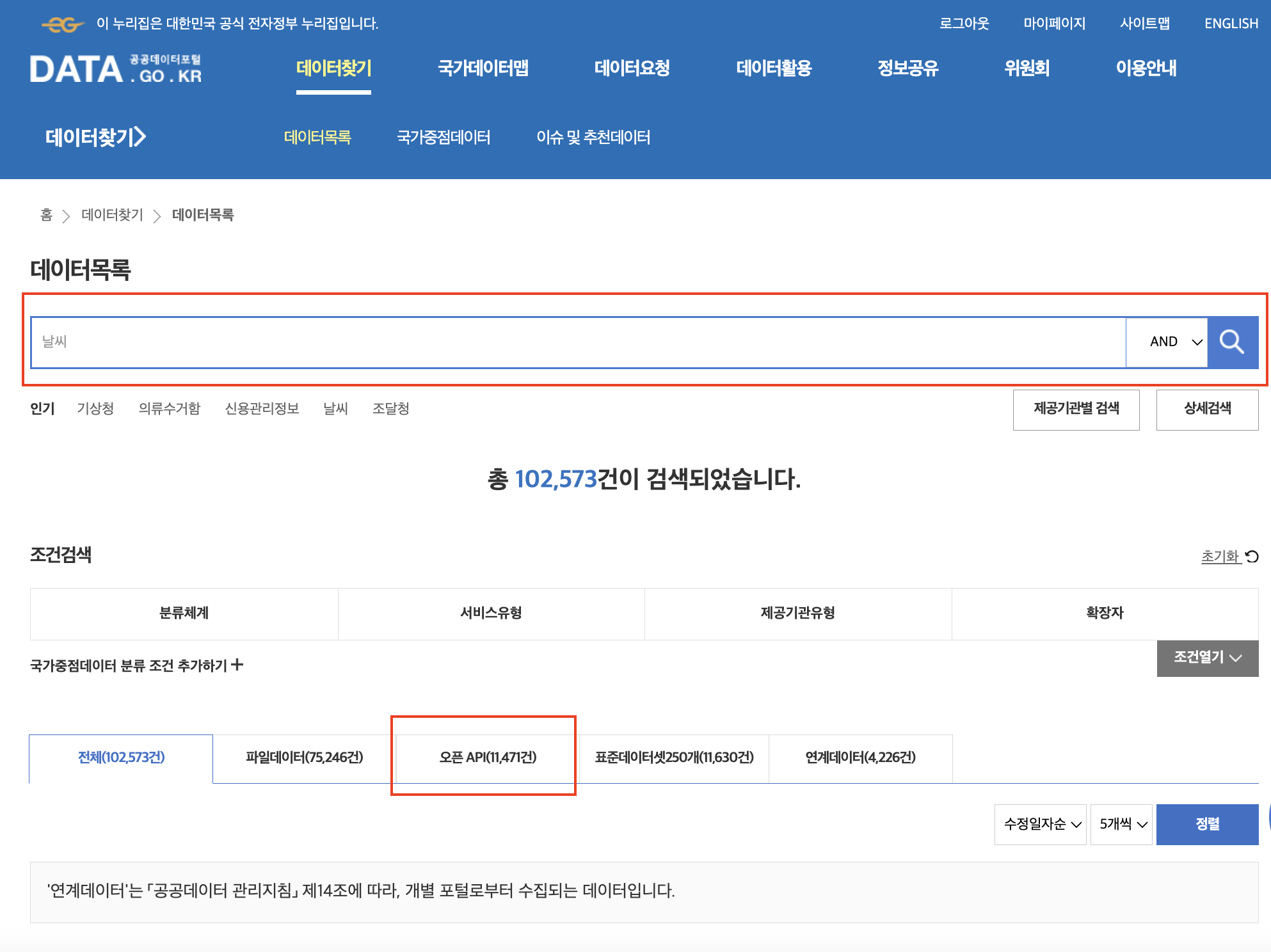 1. 공공데이터포털에서 데이터찾기 > 데이터 목록 메뉴로 이동합니다.&#x20;