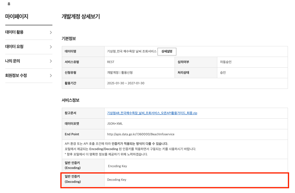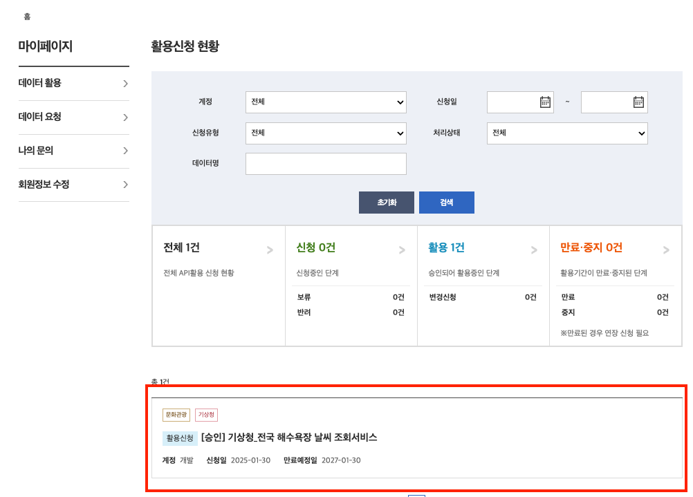 6. 마이페이지에 활용신청 된 오픈 API 목록을 보실 수 있습니다. 활용을 원하는 API 항목을 클릭합니다.