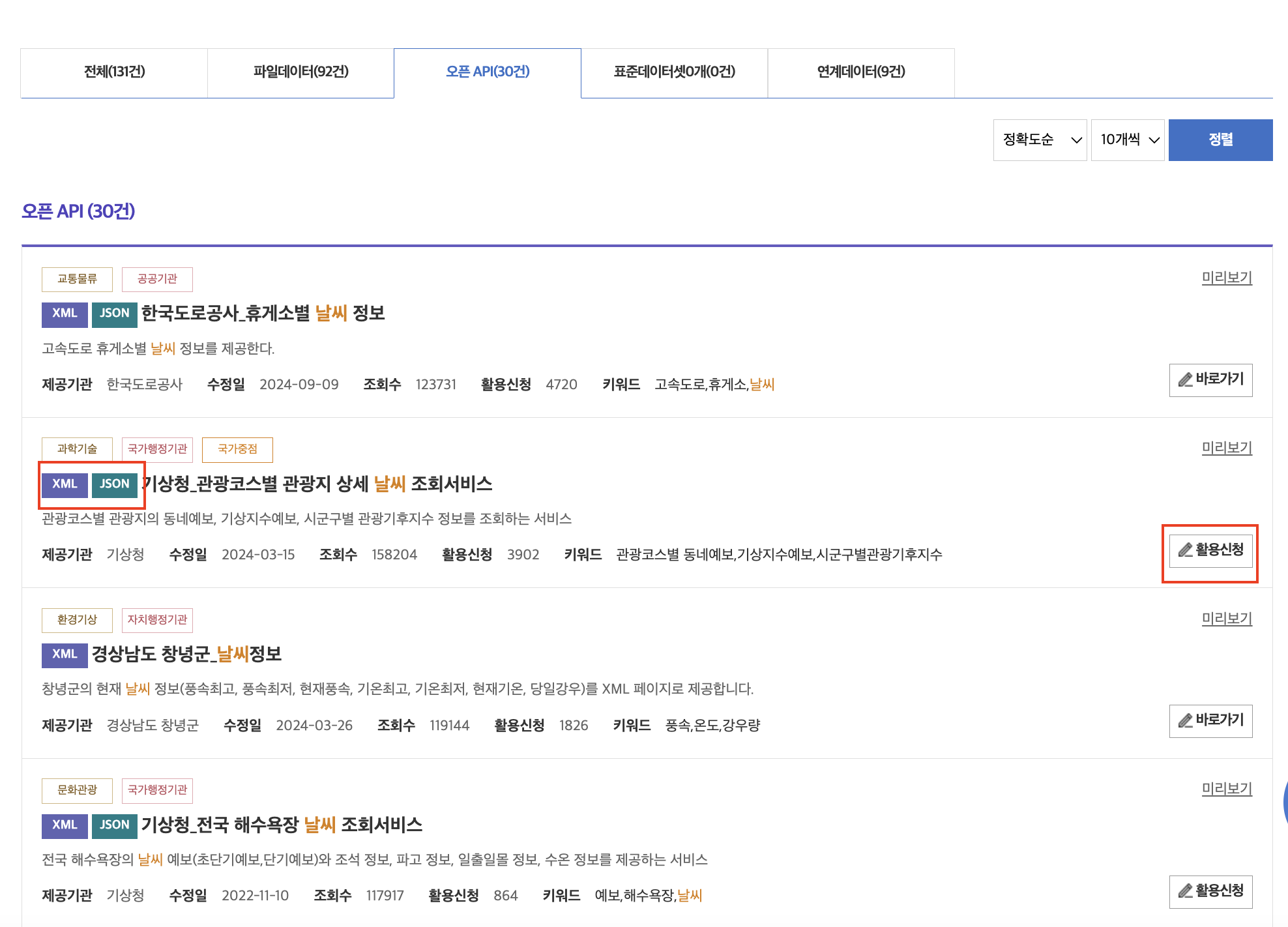 2. 데이터 조회를 원하는 키워드를 검색한 뒤 결과 내용 중 오픈 API 탭을 선택합니다.&#x20;