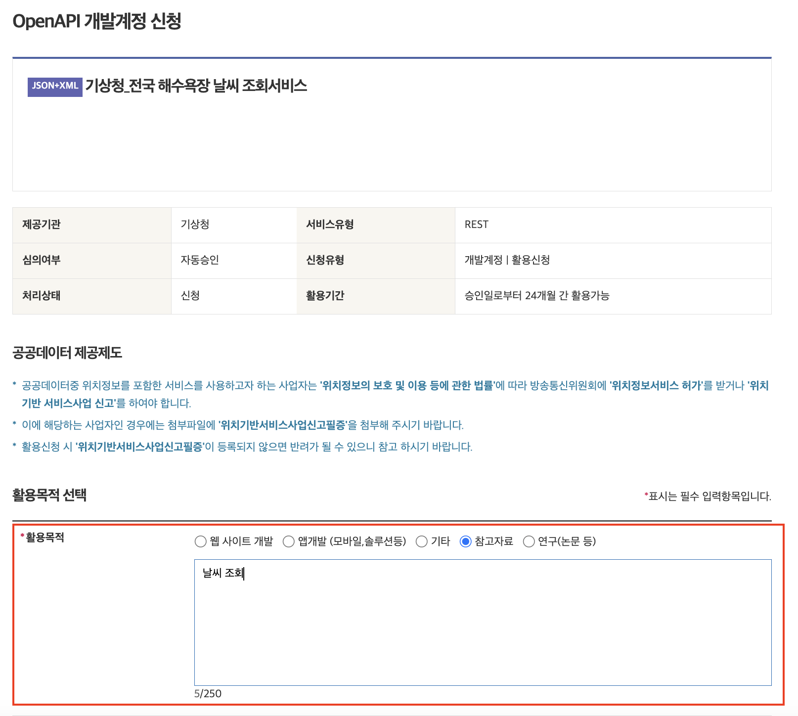 4. 활용 목적은 참고자료로 선택하고 간단한 사유를 입력합니다.