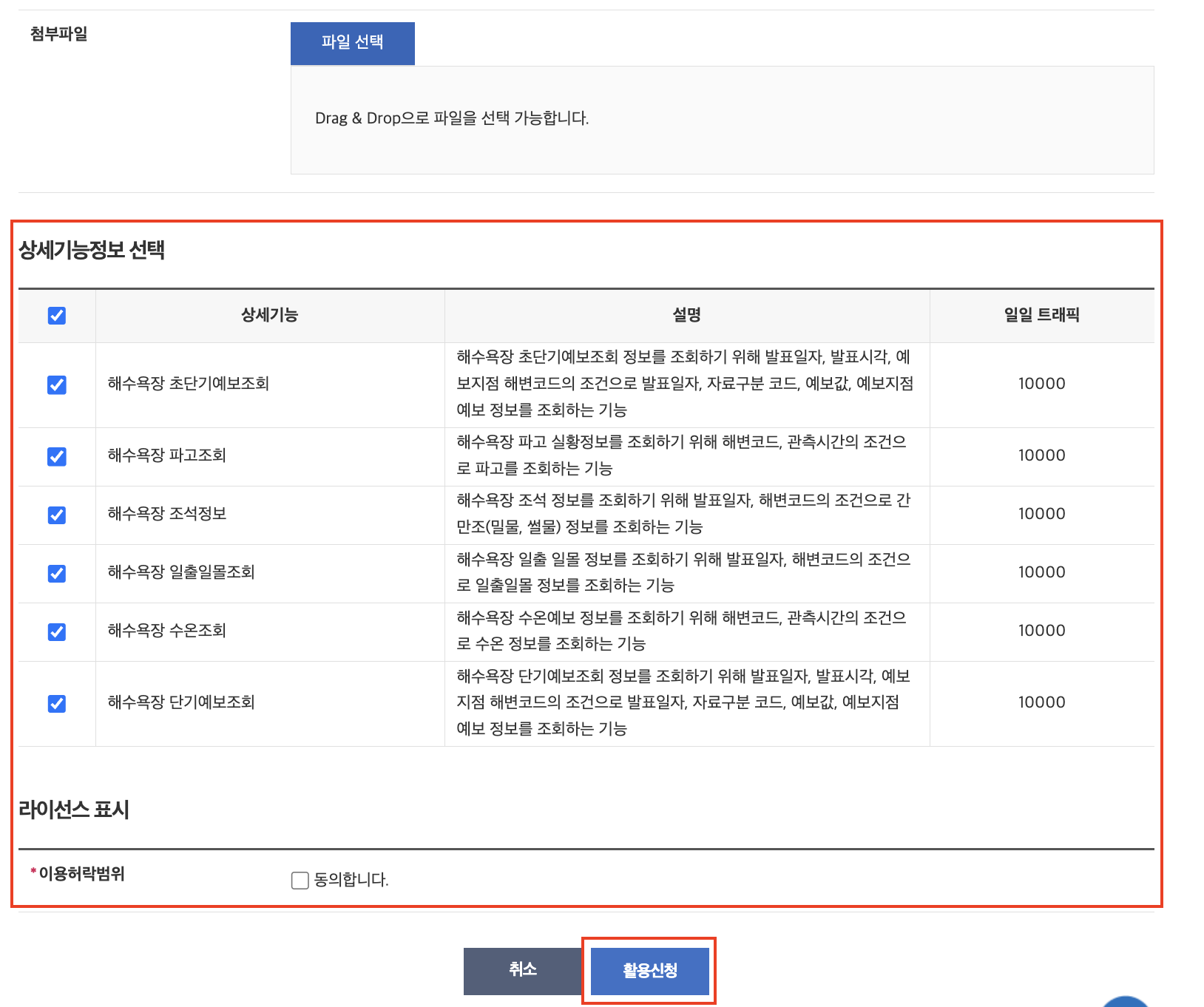5. 상세기능 정보 선택 확인 후 이용허락범위에 동의 후 활용신청 버튼을 클릭합니다.