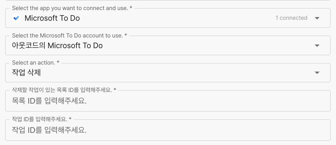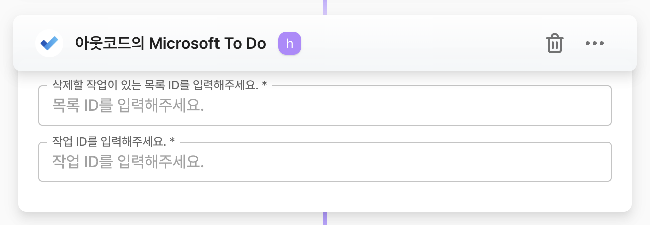 <table><thead><tr><th width="173" align="center">항목명</th><th width="288" align="center">항목소개</th><th align="center">비고</th></tr></thead><tbody><tr><td align="center">목록 ID</td><td align="center">삭제할 작업이 있는 목록 ID 입력</td><td align="center"></td></tr><tr><td align="center">작업 ID</td><td align="center">작업 ID</td><td align="center"></td></tr></tbody></table>