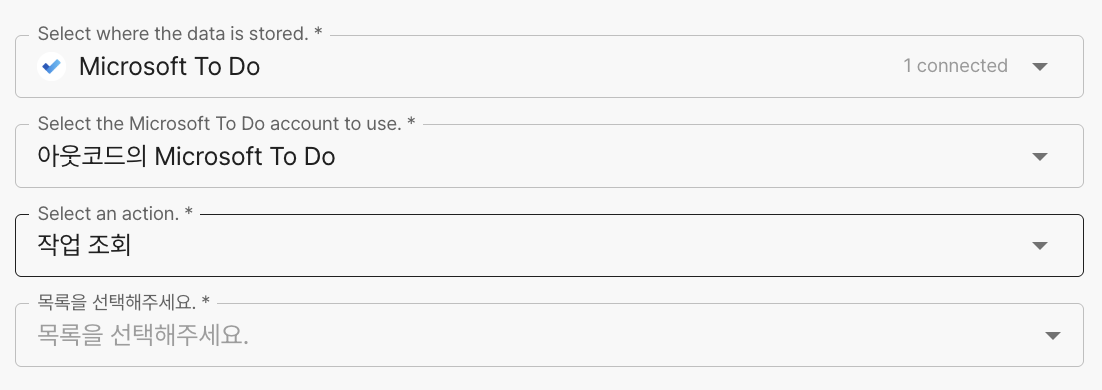 <table><thead><tr><th width="173" align="center">항목명</th><th width="288" align="center">항목소개</th><th align="center">비고</th></tr></thead><tbody><tr><td align="center">목록 선택</td><td align="center">작업을 조회할 목록 선택</td><td align="center"></td></tr></tbody></table>